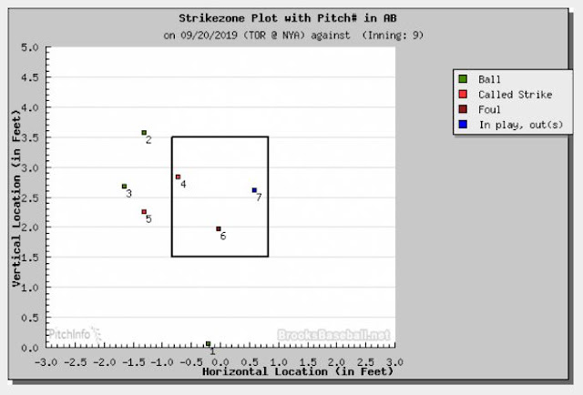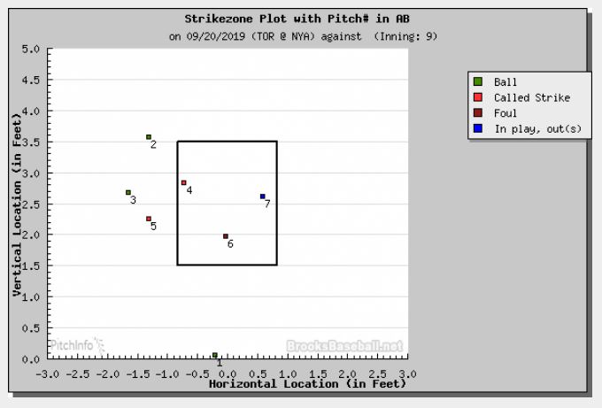Giles fanned Luke Voit, but fell behind 3-1 to Brett Gardner. Giles threw Ball 4, but West ruled that it was a strike. A pissed-off Gardner eventually flied to center and Giles closed the door by striking out Mike Ford.