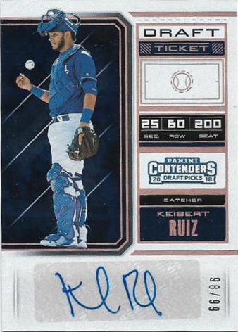 There are just two Dodger cards to chase after in the 2018 Panini Contenders Draft Picks set, and they are prospects Keibert Ruiz and DJ Peters. Check them out below. Go here for a complete checklist.