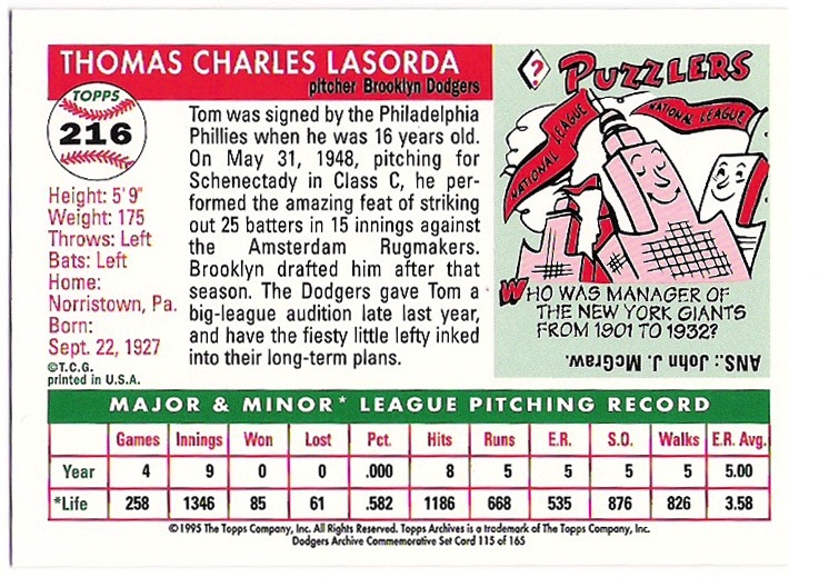 speaking of 1955 topps and completion, quite a while back i completed the 1995 topps archives brooklyn dodgers set, which includes some cards that should have been, including a 1955 topps tom lasorda card