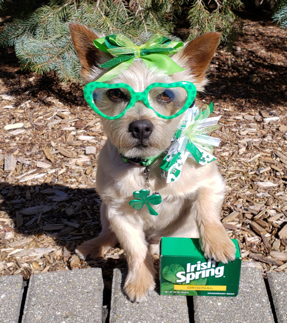 This is a photo of our friend, Chris Baumann's dog "MAIZEY" dressed up for Saint Patrick's Day!