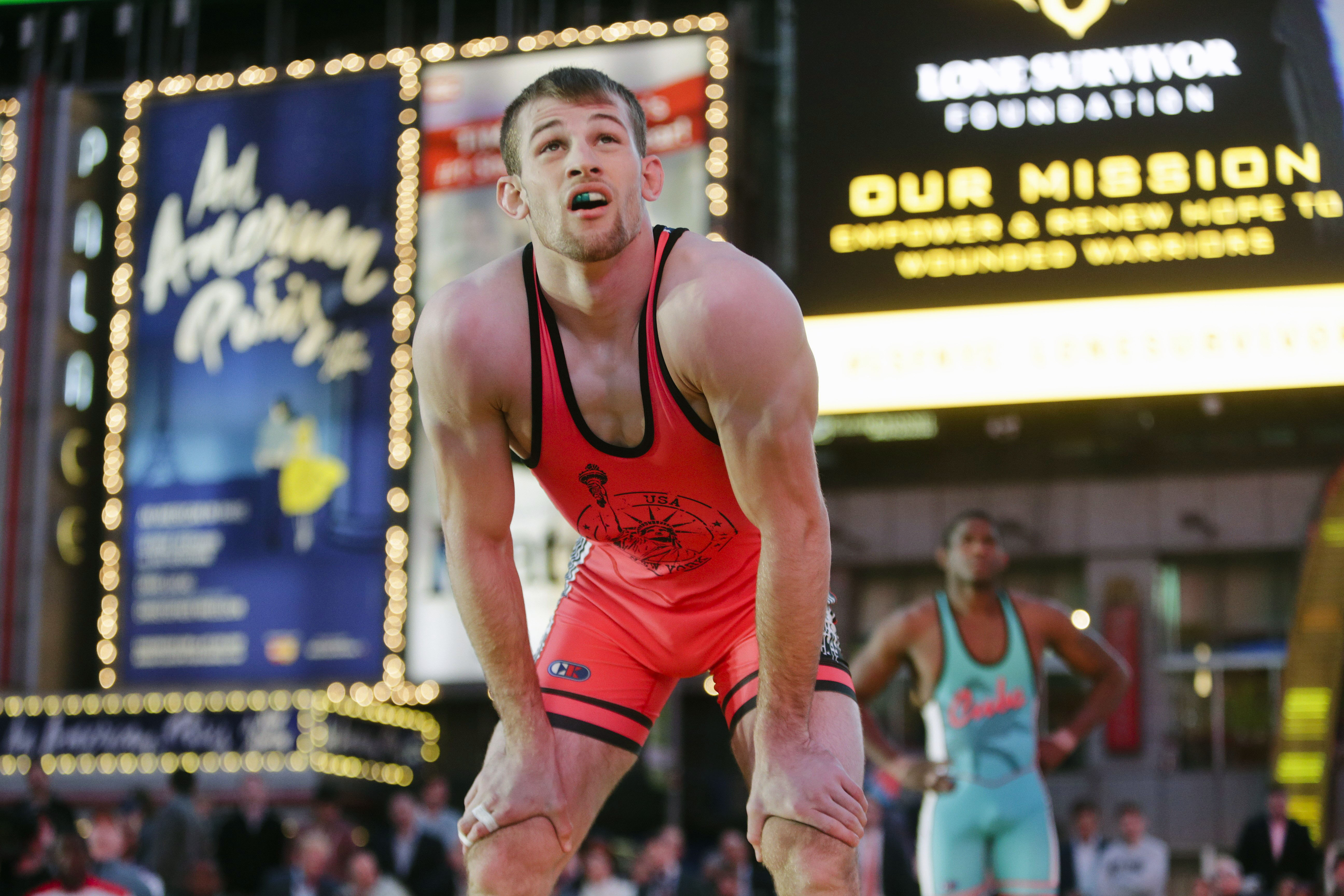 U.S. wrestlers, including Olympic champion Jordan Burroughs, grappled with Cubans in this year’s “Beat the Streets” event in Times Square, dubbed “Salsa in the Square.”