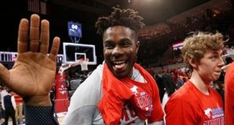 Staff Photographer Southern Methodist Mustangs forward Semi Ojeleye (33) and his teammates celebrate winning the American Athletic Conference regular season conference title at Moody Coliseum in Dallas on March 4, 2017 by beating Memphis by a score of 103-62. (Nathan Hunsinger/The Dallas Morning News)